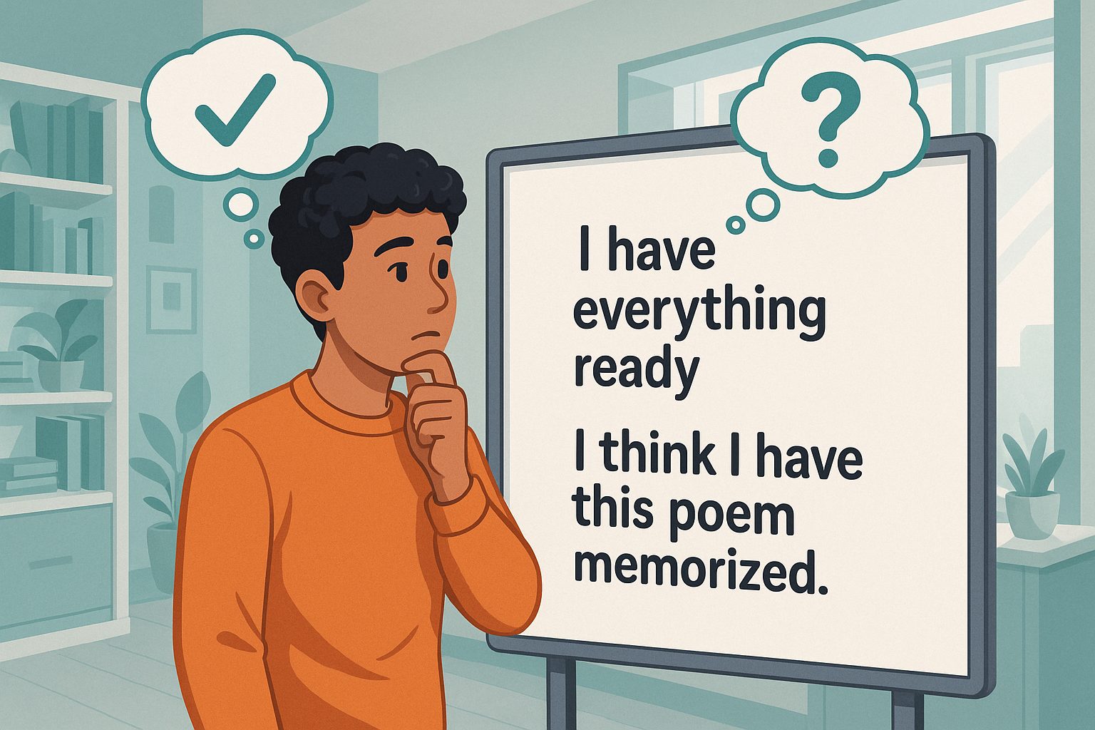 그리고 이 문장 앞에는 'I think'가 붙어있죠? 이것 때문에 뉘앙스가 살짝 달라져요. 'I think'는 '내 생각엔', '확실하진 않지만' 같은 의미를 추가해서, 시를 외운 건 맞는데 혹시 완벽하게 외웠는지 다시 확인해봐야 할 것 같다거나, 아직 완벽하진 않을 수도 있다는 조심스러운 추측의 뉘앙스를 풍긴답니다. 완벽하게 외웠다고 단정하기보다는, "외운 것 같아" 정도의 느낌인 거죠.