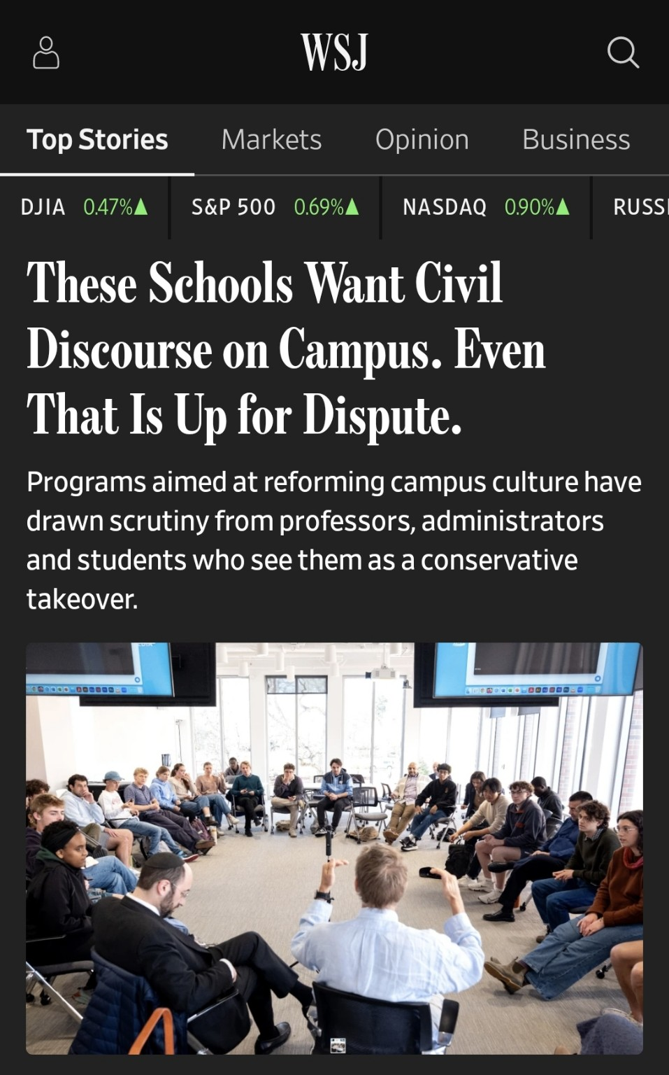- 헤드라인: "학교들은 캠퍼스 내의 품위 있는 토론(Civil Discourse)을 원하지만, 그 개념 자체가 현재 논쟁의 대상(Up for Dispute)이 되고 있다."