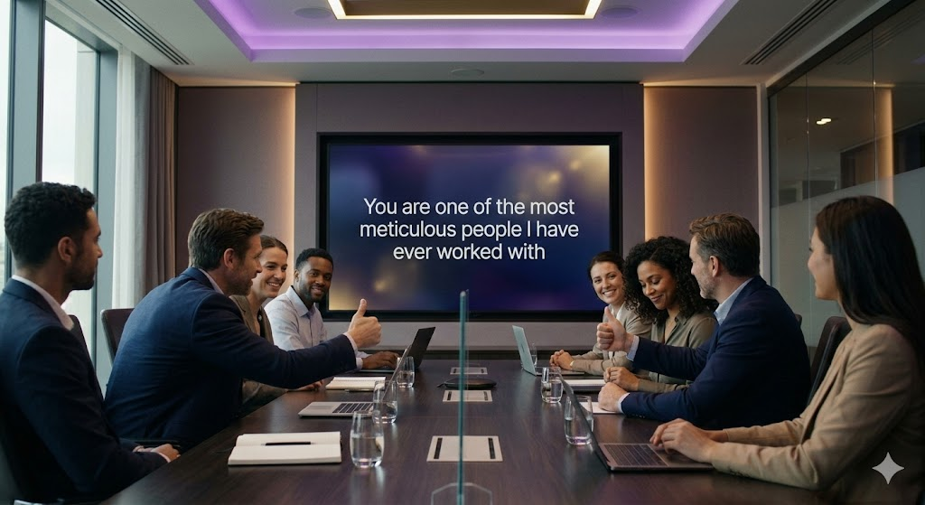 ↗ 진심 어린 칭찬: "You’re one of the MOST meticulous..." (강조와 함께 밝은 톤)