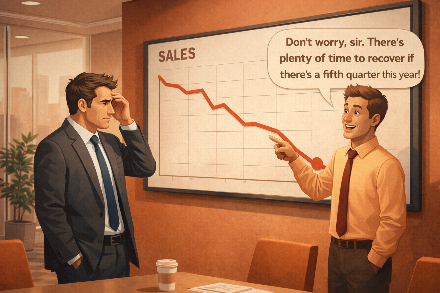 "올해 5분기가 있다면 괜찮습니다!" 실적이 바닥을 치는 회의실에서 직원이 던진 이 황당한 위로, 그 속에 담긴 뼈아픈 유머와 영어식 풍자 구조를 완벽하게 파헤쳐 봅니다.