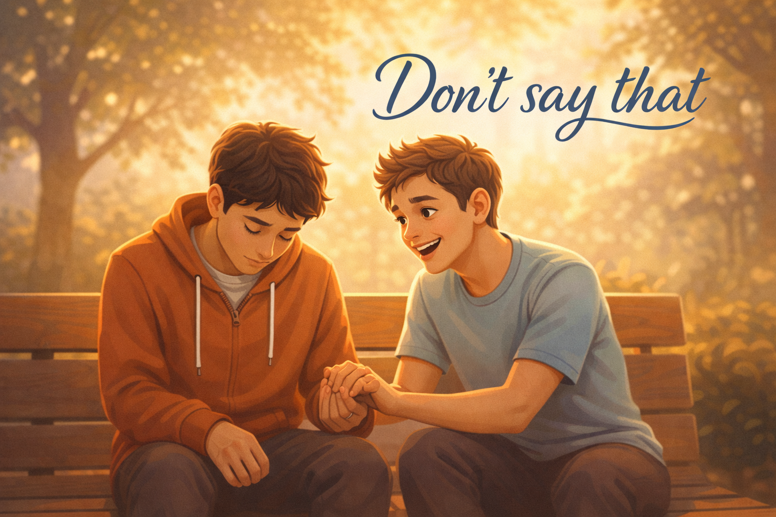 (상대방을 따뜻하게 위로하며 "Don't say that"이라고 말하는 포근한 일러스트)