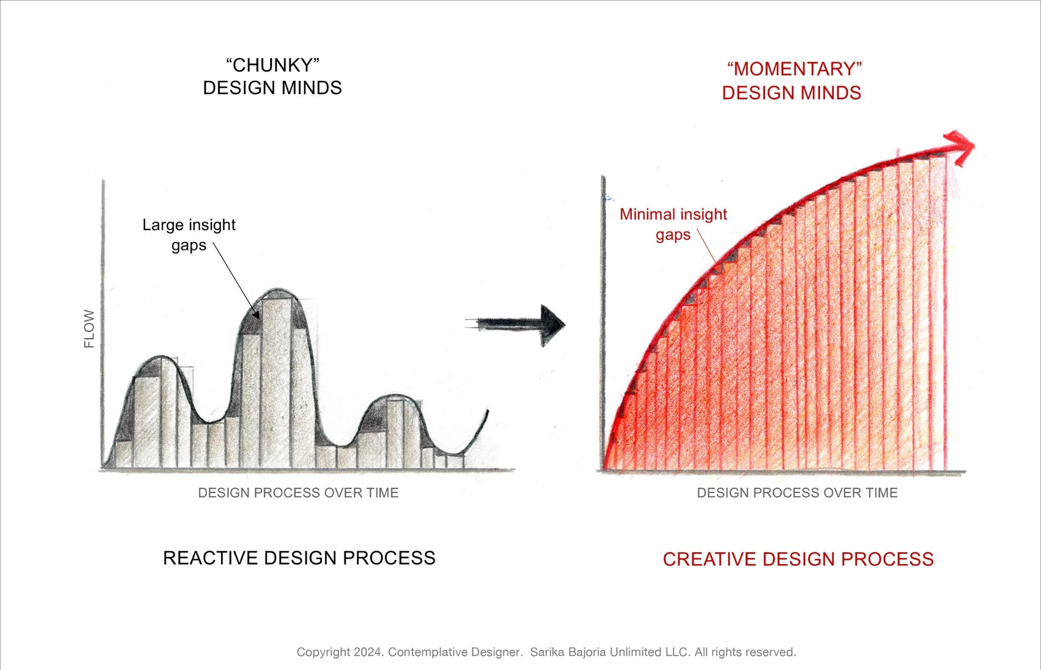 제시된 이미지는 두 가지 상반된 디자인 사고방식을 비교하고 있습니다. 왼쪽의 Chunky 사고는 불규칙하고 단절된 덩어리 형태를 띠는 반면, 오른쪽의 Momentary 사고는 아주 미세한 점들이 연속적으로 이어져 하나의 선(Flow)을 형성하고 있죠. 이것은 단순한 그림이 아니라 “우리가 디자인과 창의적 작업을 어떻게 진행하느냐”에 대한 철학적 비교입니다.