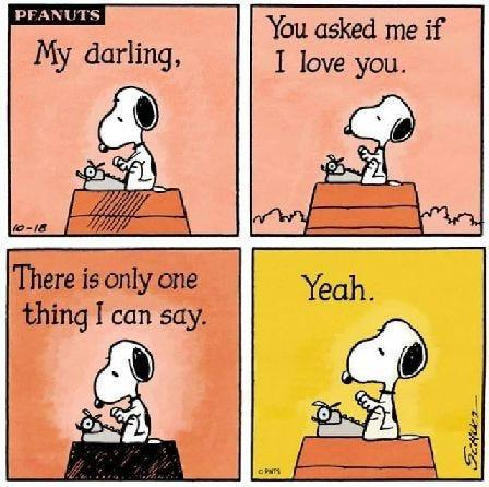 A: 'Yes'는 좀 더 공식적이고 딱딱한 느낌이고, 'Yeah'는 친구나 연인 사이에서 쓰는 아주 편안하고 자연스러운 표현이에요. 여기서는 'Yeah'가 스누피의 진솔함을 더 잘 살려주죠.