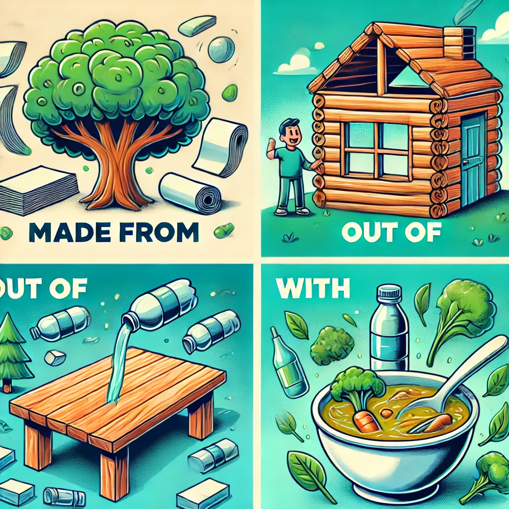 - Made out of: 재료의 성질은 유지되지만, 용도가 완전히 새롭게 바뀔 때 (주로 재활용, 창의적 재탄생. 예: 폐 플라스틱병으로 집). 💡✨