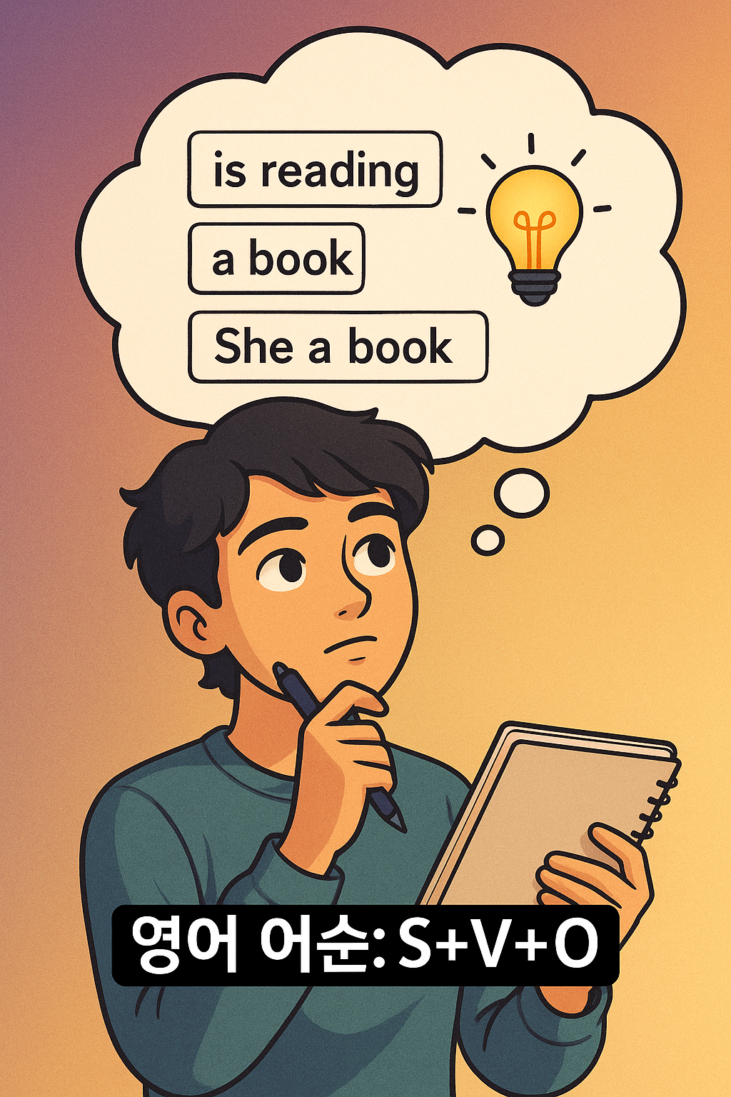 - 영어는 어순이 고정되어 있어요: 한국어와 달리 조사가 없기 때문에 단어의 위치가 아주 중요합니다.