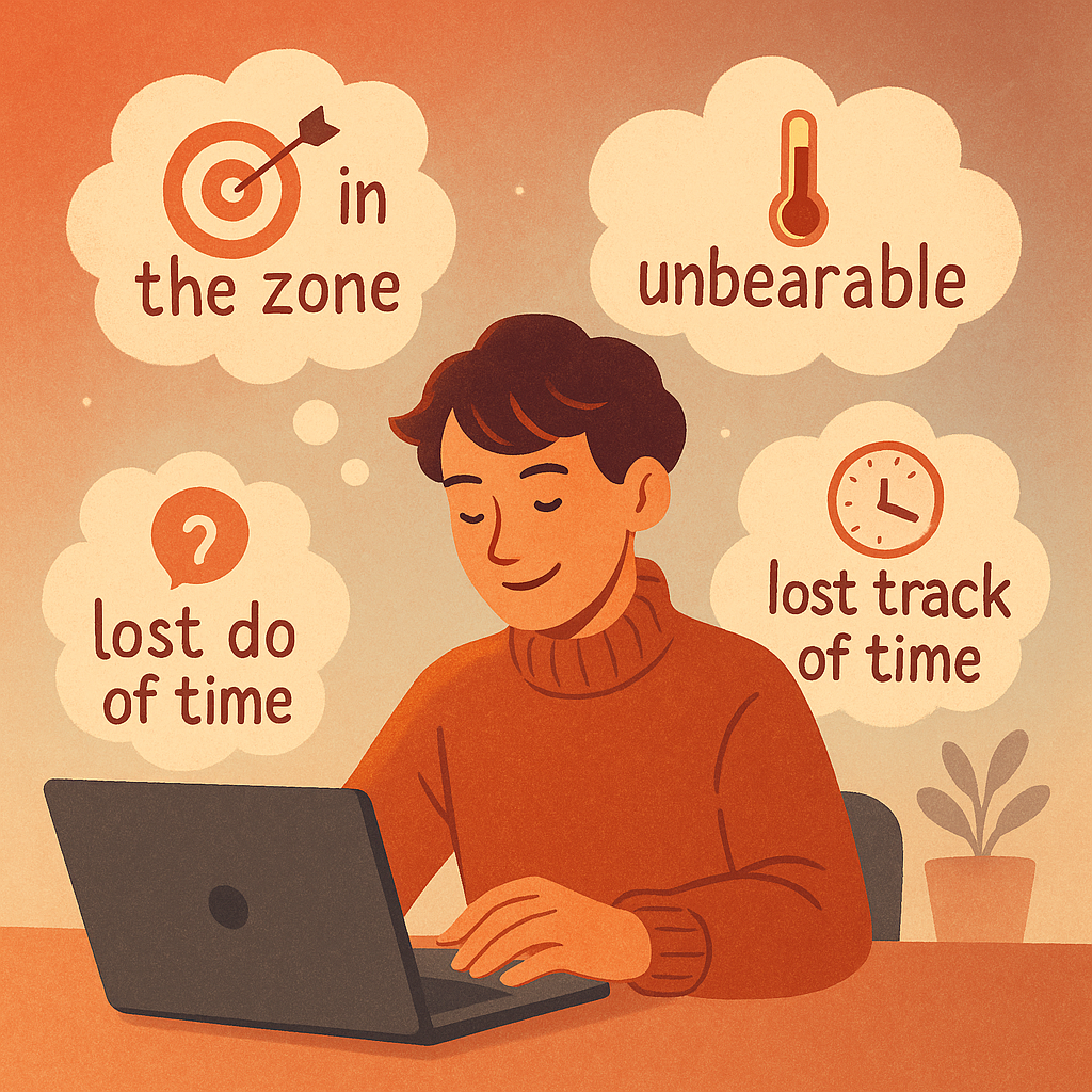 • I was in the zone and lost track of time. (너무 몰입해서 시간 가는 줄 몰랐어.)