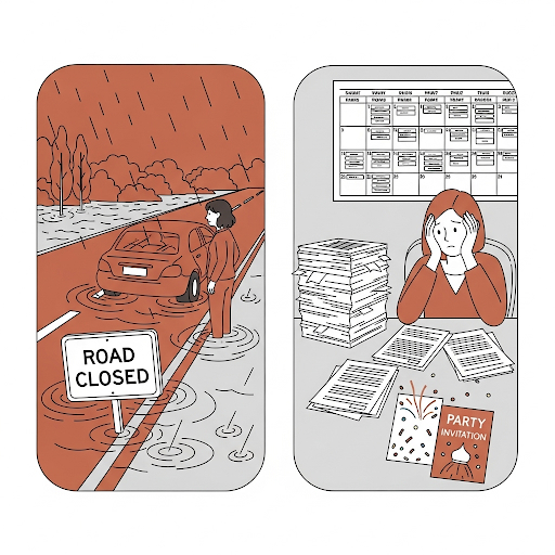 | I can't go (there) | 물리적 장애물 때문에 '출발'조차 불가능한 그림 | 도로 폐쇄, 다리 붕괴 등 물리적 이동이 막혔을 때 |