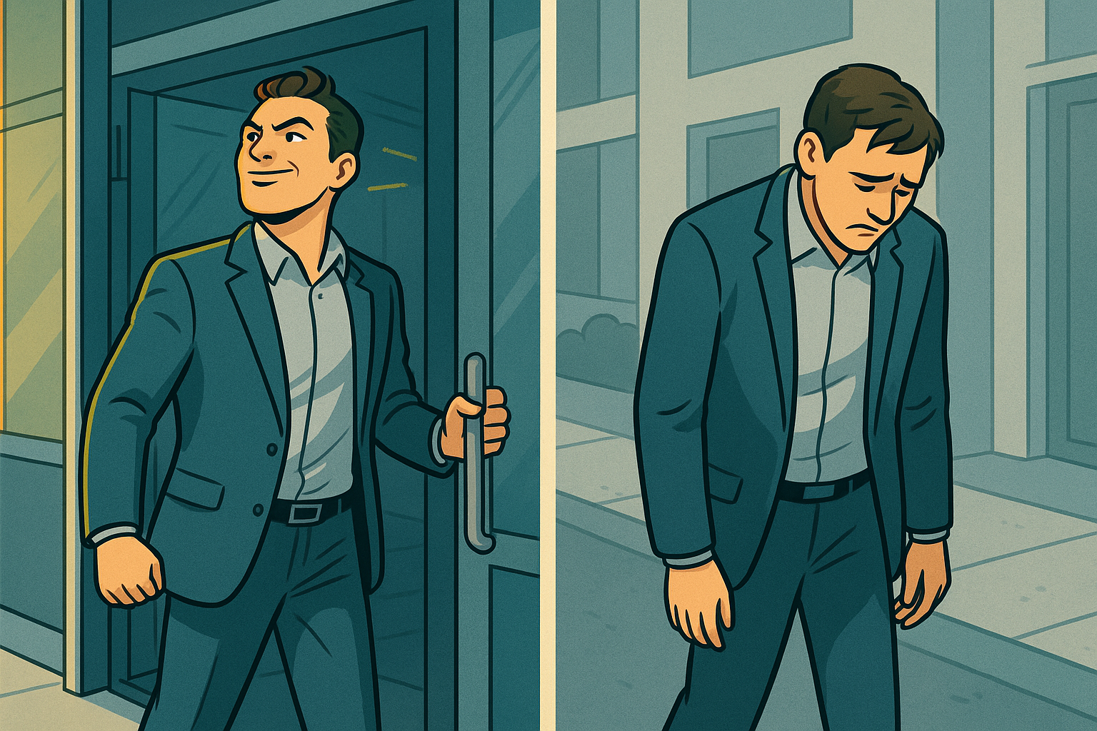 (그는 면접장에서 나올 때 수치스럽고 패배한 듯 보였다.)
