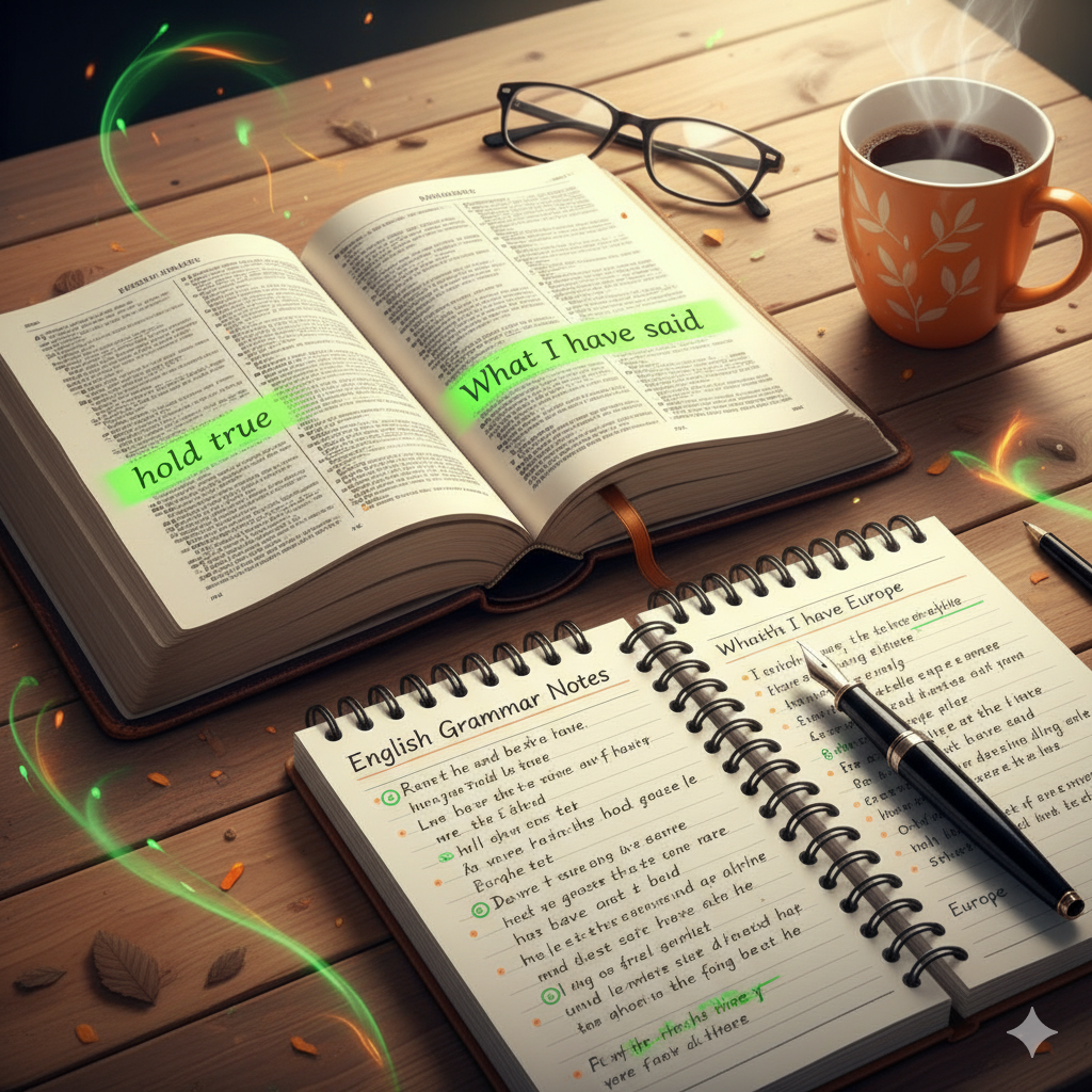 가장 중요한 포인트는 주어 부분인 "What I have said"입니다. 여기서 'What'은 선행사를 포함하는 관계대명사예요. 그래서 **'내가 말한 것'** 이라는 하나의 명사 덩어리(명사절)로 주어 역할을 하고, 동사는 단수 취급하여 **holds**가 된답니다. 놓치기 쉬운 문법 포인트였죠? 🤩