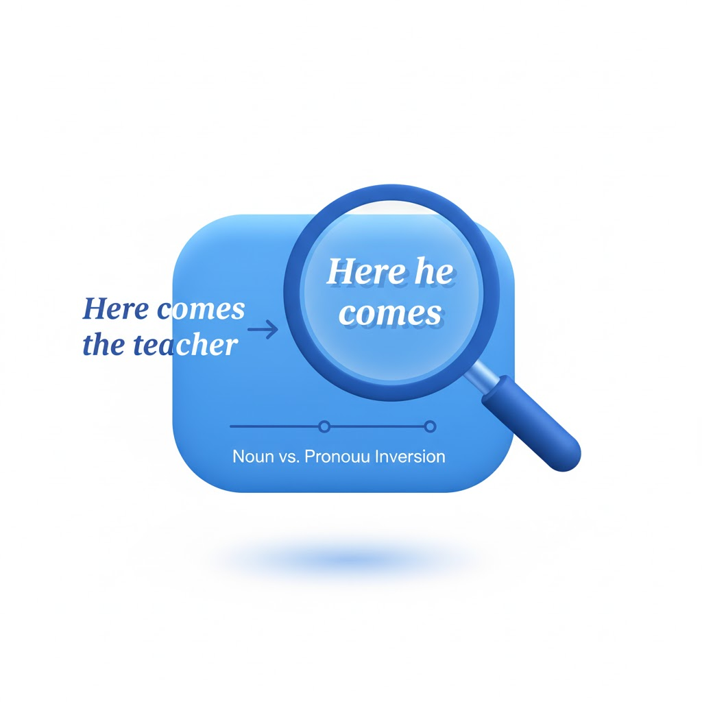 가장 흔한 실수는 대명사 주어일 때도 도치를 시도하는 거예요. **"Here comes he"**라고 말하면 문법적으로 **틀립니다!** 대명사(he, she, it 등)는 문장의 맨 앞에 오는 것을 선호하지 않기 때문에, 무조건 **Here + 대명사 + 동사** 순서를 지켜야 한다는 점을 꼭 기억해 주세요!