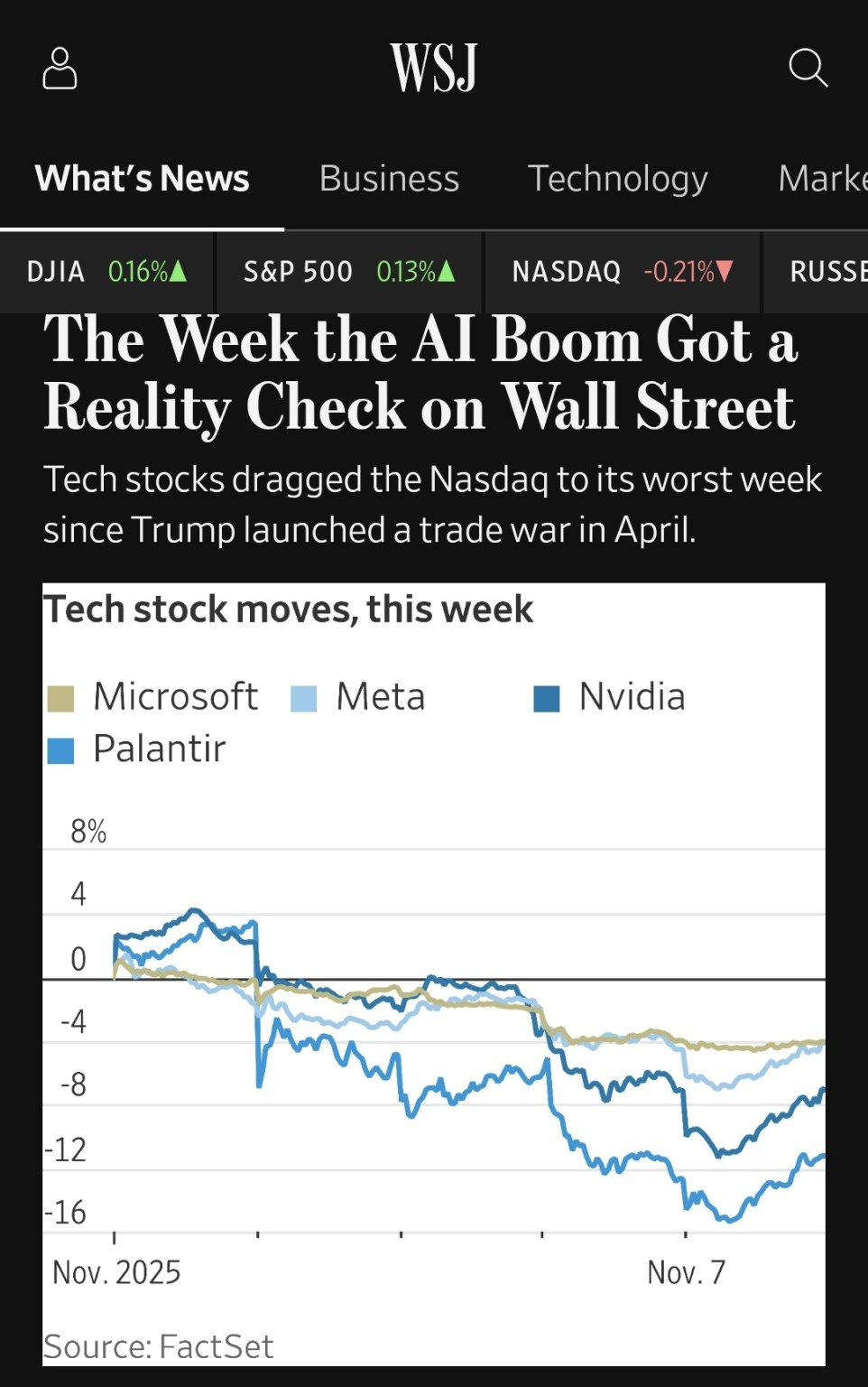 하지만 월스트리트저널(WSJ)의 2025년 11월 초 기사 제목처럼, 지난 한 주는 정말 충격적이었습니다. AI 관련 기술주들이 줄줄이 급락하면서 나스닥이 트럼프 전 대통령이 무역전쟁을 시작했던 그 해 4월 이후 최악의 한 주를 보냈다고 하네요. 와, 이 정도면 심각한 '경고'를 받은 거나 다름없지 않나요?