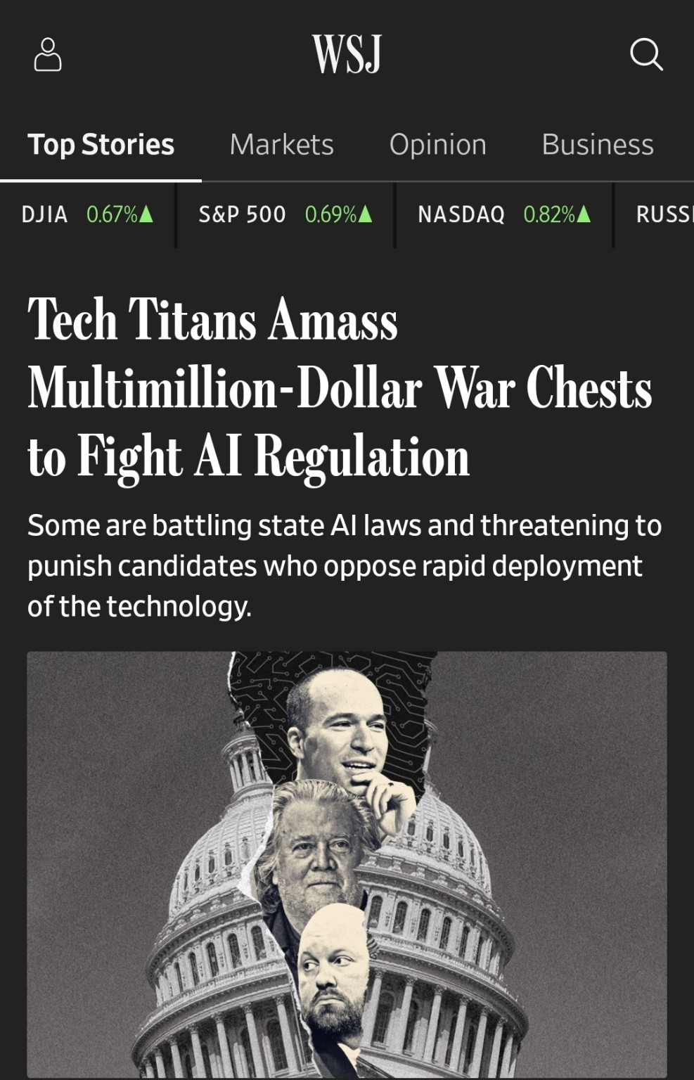WSJ 기사("Tech Titans Amass Multimillion-Dollar War Chests to Fight AI Regulation")는 이 문제를 아주 적나라하게 보여줍니다. 핵심 요지는 바로 주요 테크 기업의 거물들이 AI 규제를 반대하거나 약화시키기 위해 천문학적인 규모의 정치 자금을 모으고 있다는 거예요.