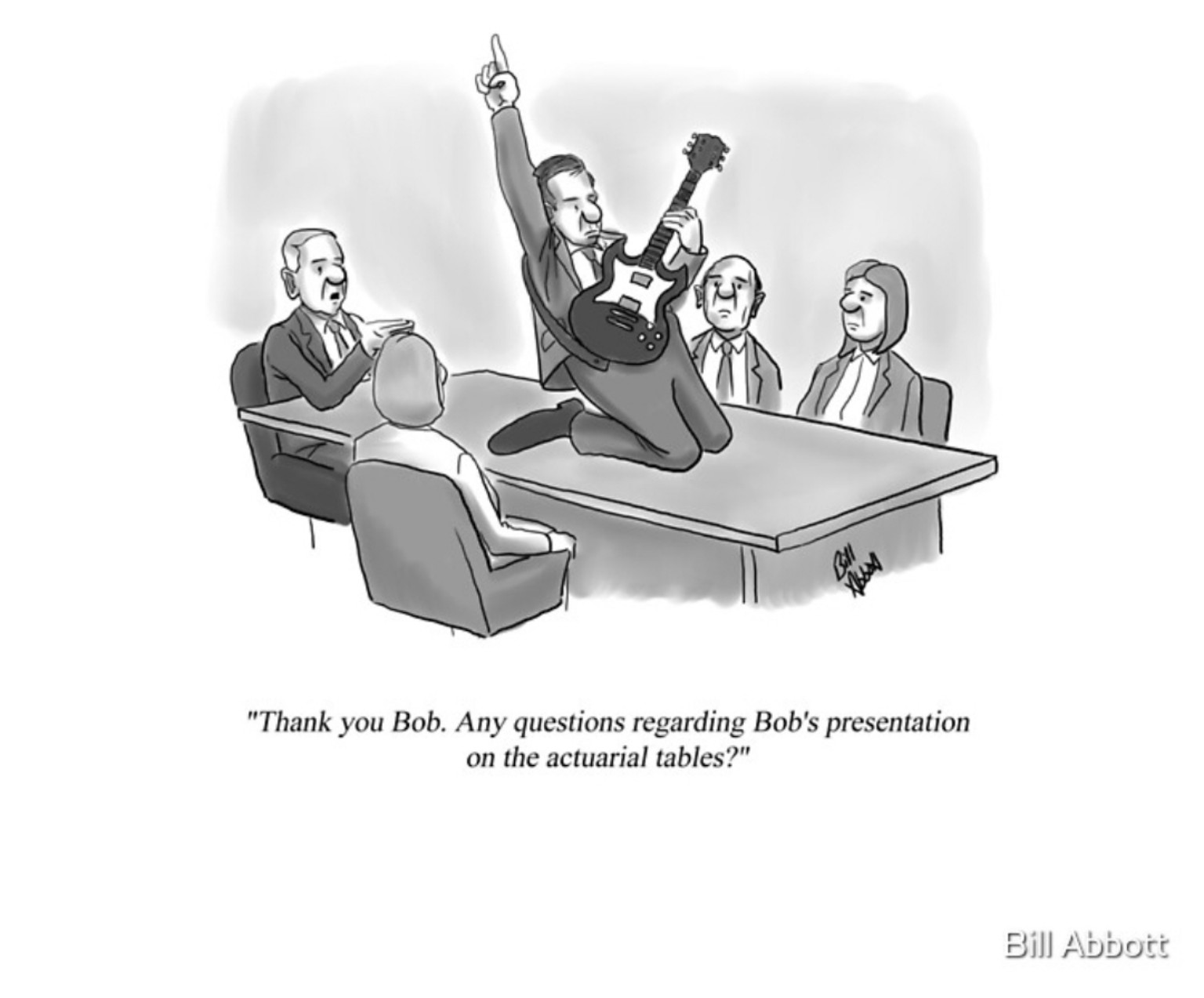 "보험 통계표 발표에 대해 질문 있나요?" 비즈니스 현장의 황당함을 풍자한 Bill Abbott의 카툰을 통해 원어민만 느끼는 아이러니한 유머와 실전 영어 표현을 배워보세요! 😊여러분, 회사 회의 중에 갑자기 누군가 테이블 위로 올라가 록스타처럼 기타를 친다면 어떨까요? 생각만 해도 황당하죠? 😂 오늘은 미국의 유명 카툰 작가 Bill Abbott의 작품 속에 등장하는 아주 흥미로운 영어 표현을 가져왔습니다. 겉으로는 평범한 비즈니스 영어 같지만, 상황과 대조해 보면 무릎을 탁 치게 되는 유머가 숨어있거든요. 함께 살펴볼까요? 오늘의 영어 표현 (Original Text) 📝"Thank you Bob. Any questions regarding Bob's presentation on the actu..