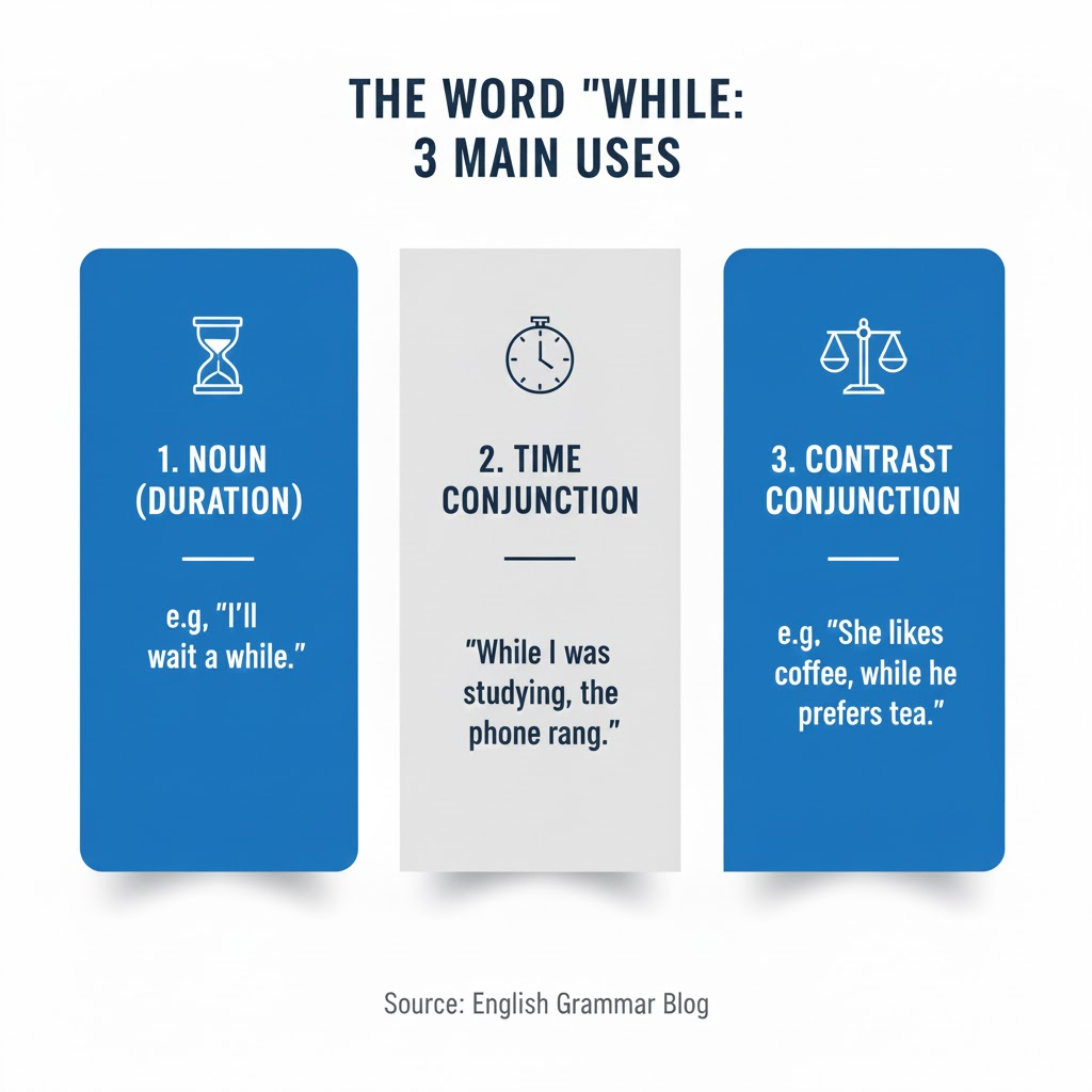 While의 3가지 얼굴? 명사부터 접속사까지 핵심 용법 완벽 해부! 영어 공부를 하면서 'while' 때문에 헷갈렸던 적 많으시죠? 이 글에서 while의 구조적, 논리적 3대 핵심 용법을 완벽하게 정리하고, 실전에서 바로 쓸 수 있는 미국식 예문과 함께 마스터할 수 있도록 도와드릴게요!안녕하세요, 여러분! 영어 공부하다가 정말 사소한 단어인데도 자꾸 헷갈리는 경우가 있잖아요? 저는 개인적으로 'While' 이 그랬던 것 같아요. 분명히 쉬운 단어인데, 어떤 때는 '동안'이라고 했다가, 어떤 때는 '반면에'라고 하니 문장을 볼 때마다 해석이 왔다 갔다 하더라고요. 특히 독해나 긴 글쓰기를 할 때마다 이 'while' 때문에 문장의 구조를 잘못 파악해서 낭패를 본 경험도 솔직히 말해서 몇 번 있답니다. ..